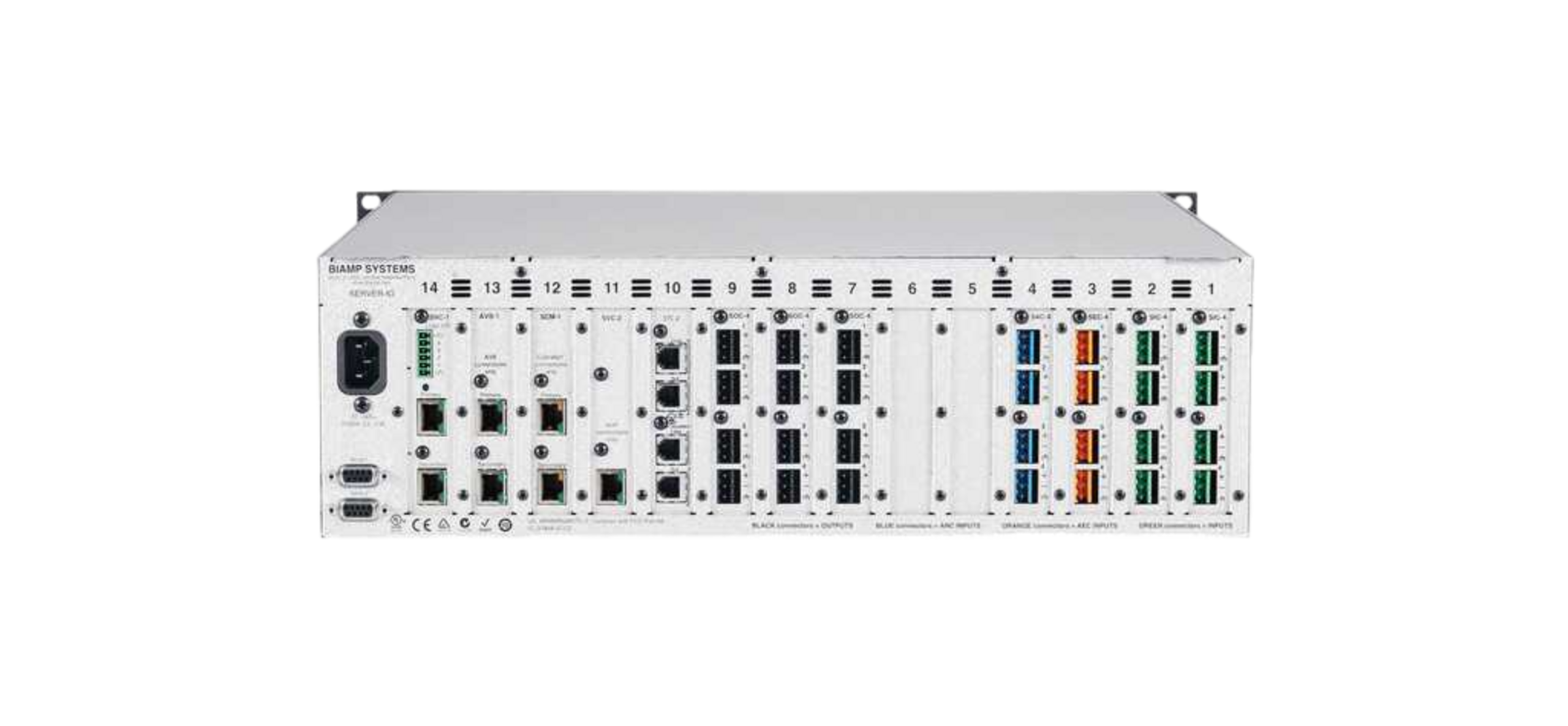It is factory configured with one DSP-2 card (capable of handling up to two additional DSP-2 cards) and one AVB-1 network card (capacity for three total audio networking cards per server). The combinations of networking cards may include one AVB-1 Audio Video Bridging network cards, up to two SCM-1 CobraNet network cards, and up to two DAN-1 Dante network cards in any configuration.