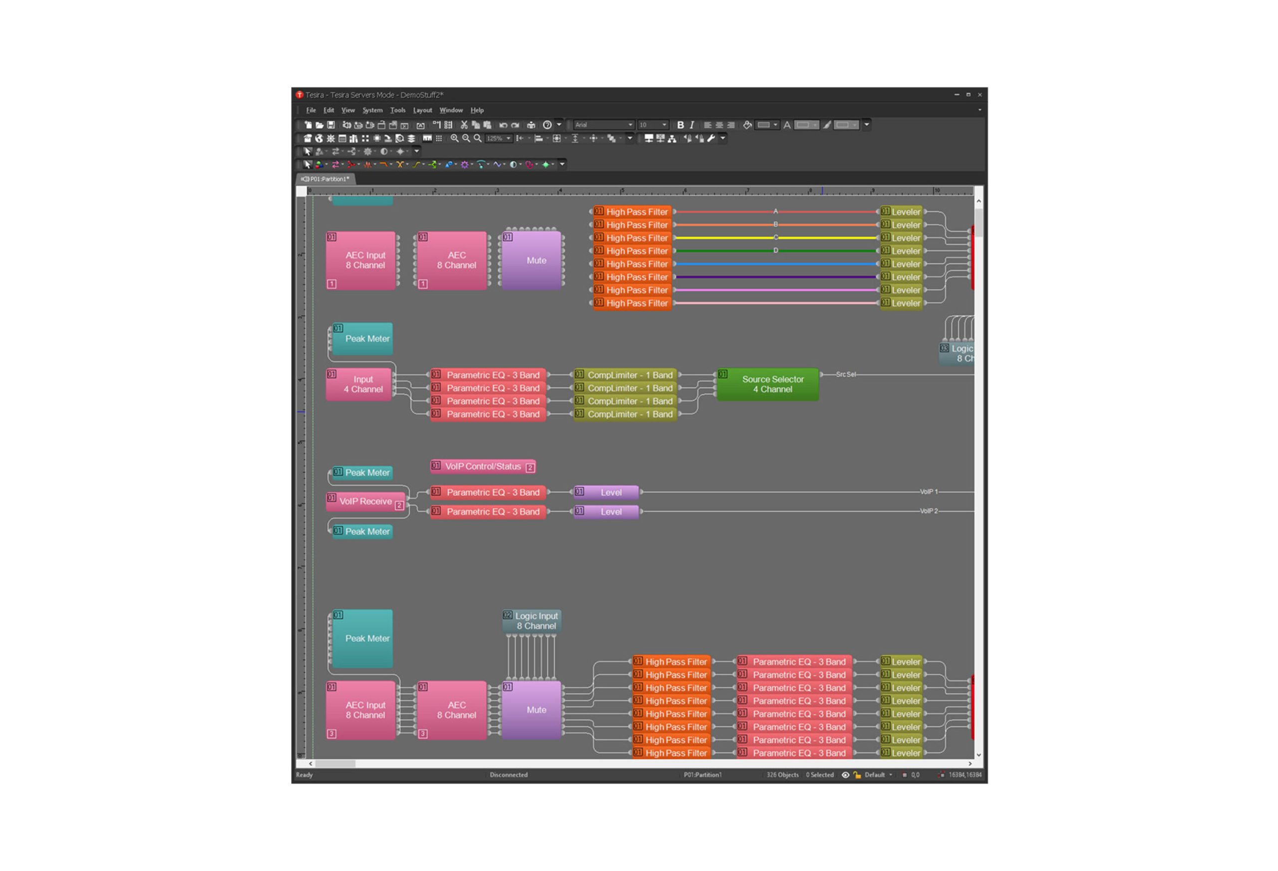 Tesira design software is the interface for all system configurations. Creating the processing and system design for the application is done through a simple drag-and-drop interface. Toolbars allow control of processing, control, and diagnostic elements. Making audio and logic connections is fast and easy, and several options are available for displaying connection lines. System tools allow for easy device discovery and system configuration uploads.