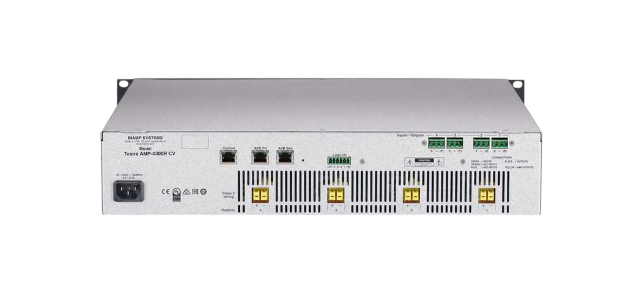 The Tesira AMP-4300R CV is a constant voltage 70V/100V, digital networked, four channel amplifier. It is AVB/TSN enabled and delivers 300 watts per channel. It is rack mountable and part of an integrated Tesira audio network. It also offers fault reporting, impedance monitoring, and optional analog failover. The Tesira AMP-4300R CV complies with the United States Trade Agreement Act (TAA), allowing it to be included in GSA Schedule contractorsâ sales bids for the U.S. federal government.