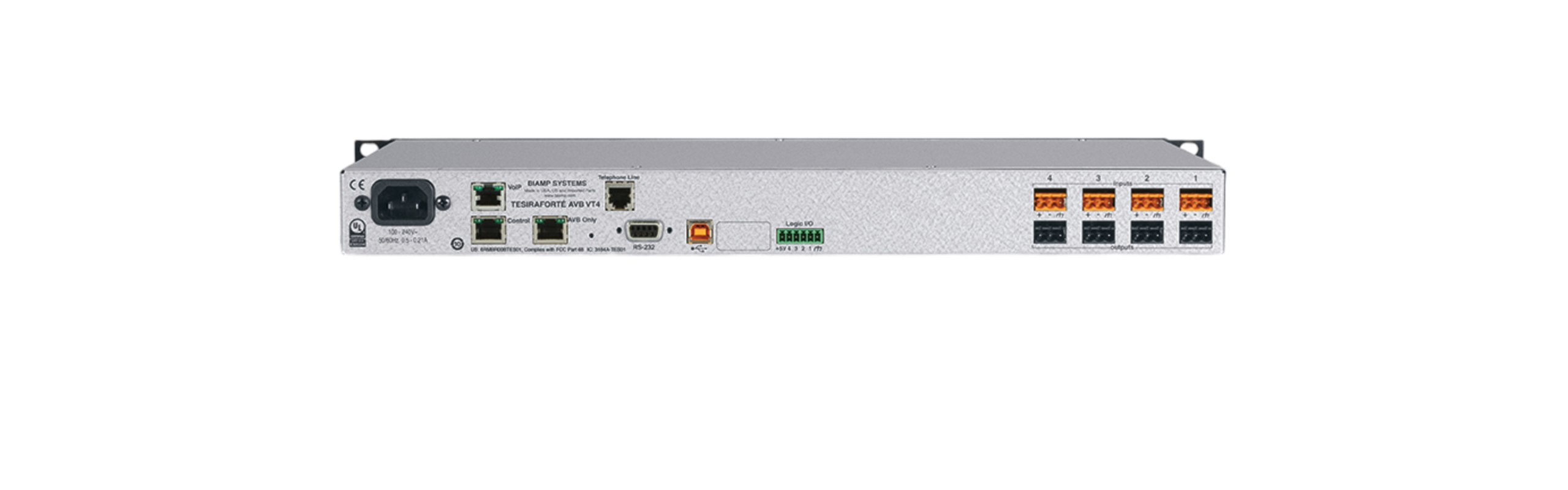 The TesiraFORTÉ AVB VT4 is a digital audio server with 4 analog inputs and 4 analog outputs, and includes Acoustic Echo Cancellation (AEC) technology on all 4 inputs. It includes up to 8 channels of configurable USB audio, a 2-channel VoIP interface, and a standard FXO telephone interface. TesiraFORTÉ AVB VT4 utilizes AVB/TSN digital audio networking, and can be used as a standalone device or combined with other TesiraFORTÉ AVB devices and Tesira DSPs, expanders, endpoints, and controllers.