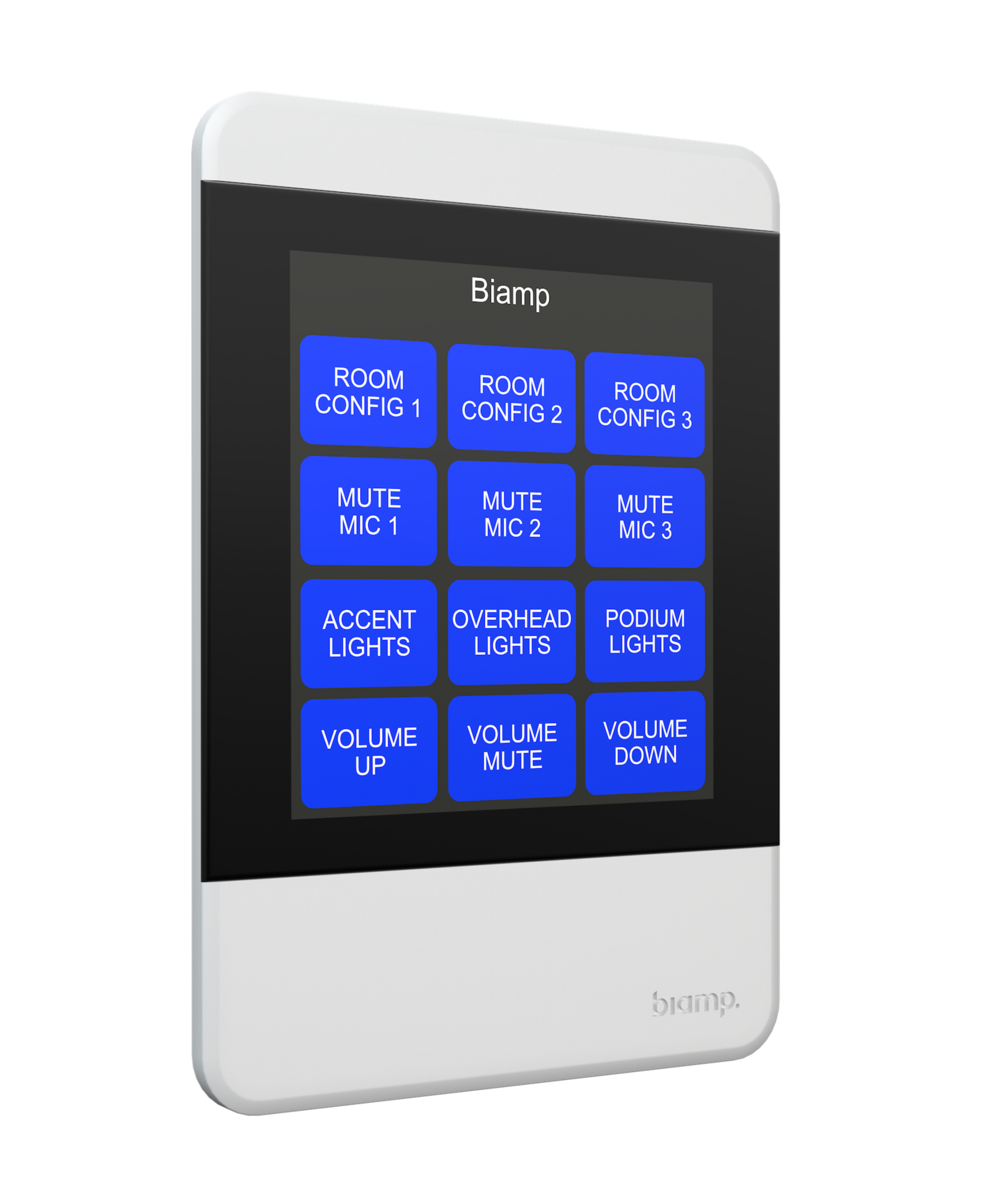 Networked, touch-enabled AV control pad for Tesira systems.